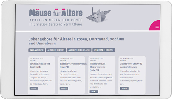 Wir haben die Website „Mäuse für Ältere“ geschaffen mit einer Jobbörse für Ältere, Unterstützungsangeboten, News, Erfahrungsberichten und Terminen